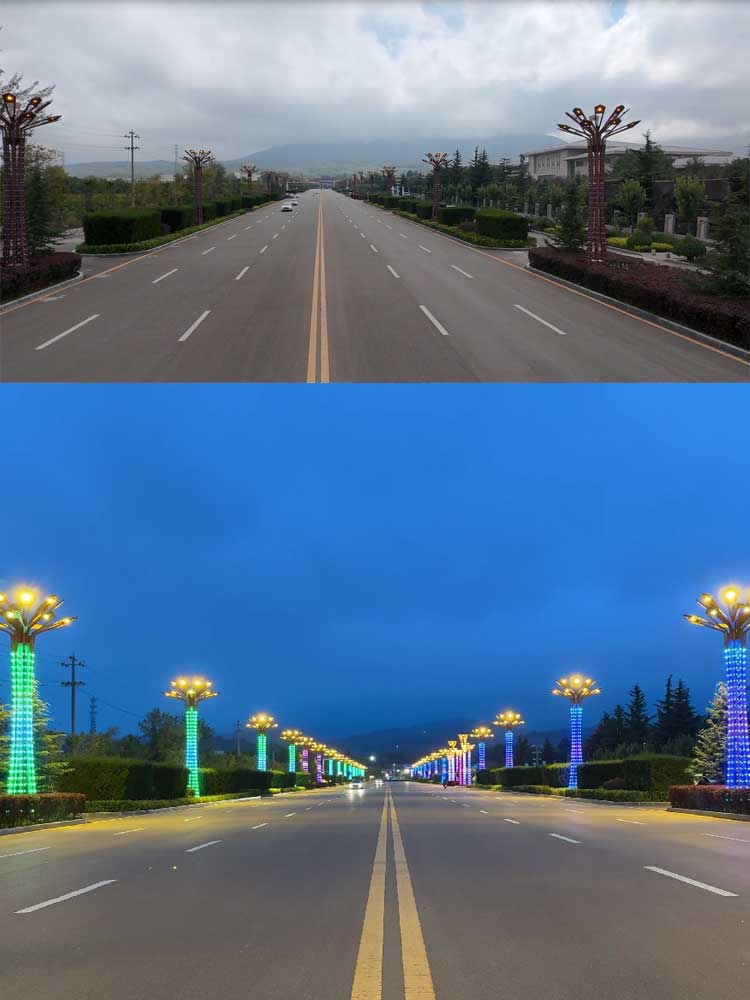 甘肅平?jīng)?米景觀燈項(xiàng)目,安裝位于崆峒山下的市政道路倆側(cè),主光源采用16個(gè)LED模組光源組成,配合燈體400的RGB點(diǎn)光源構(gòu)成,系統(tǒng)采用512控制,夜晚整體趁現(xiàn)炫彩效果,亮化倆側(cè)道路。